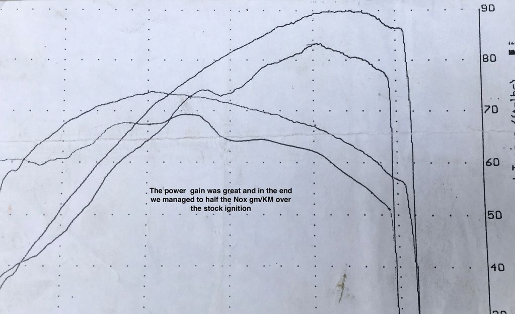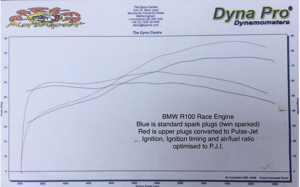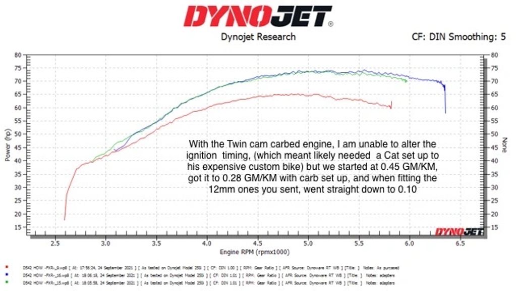 This is the dyno chart carried out by The National Emissions Testing Centre on a Harley Davidson using PJI12LR. The Chief engineers comments are written on the chart.